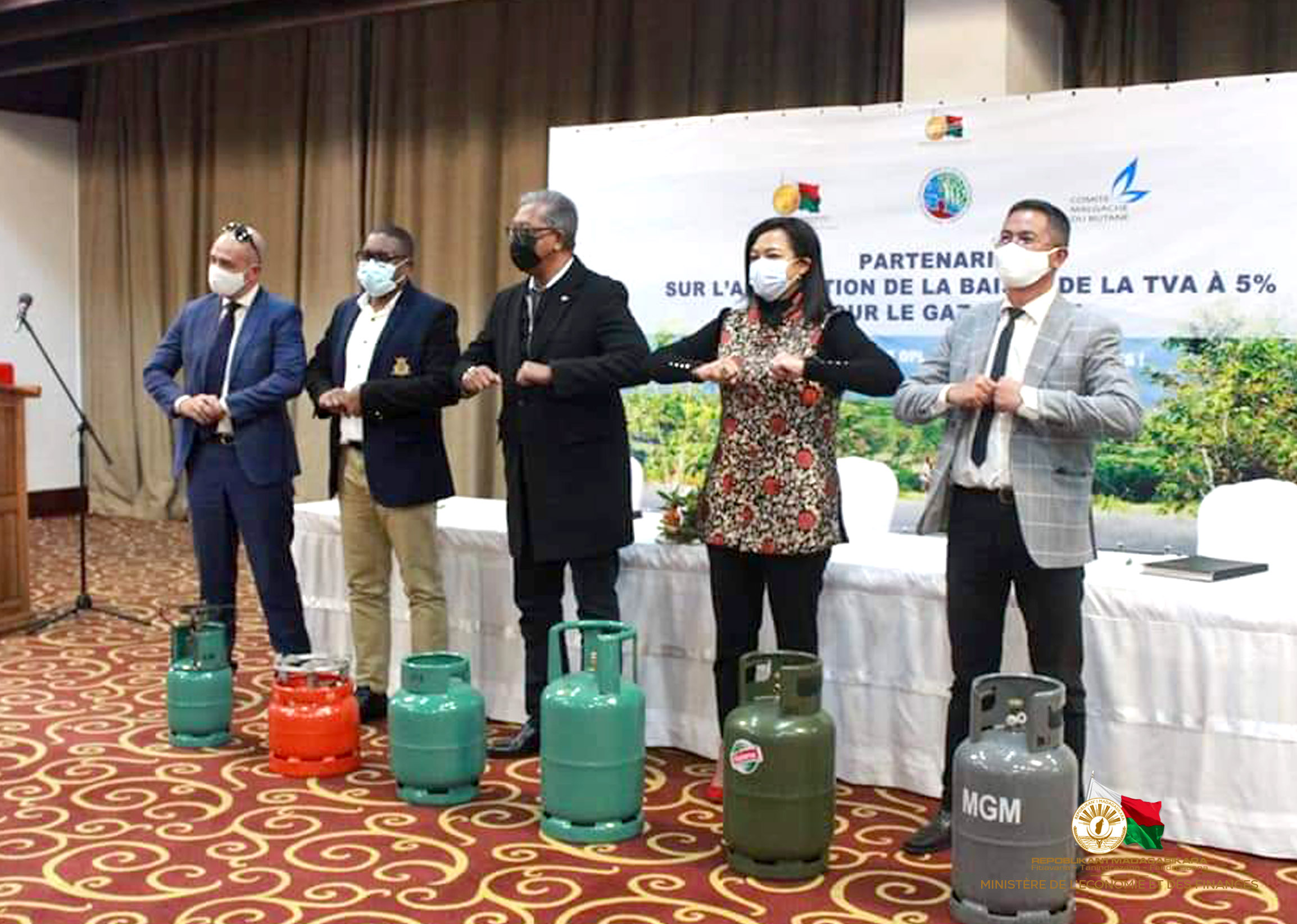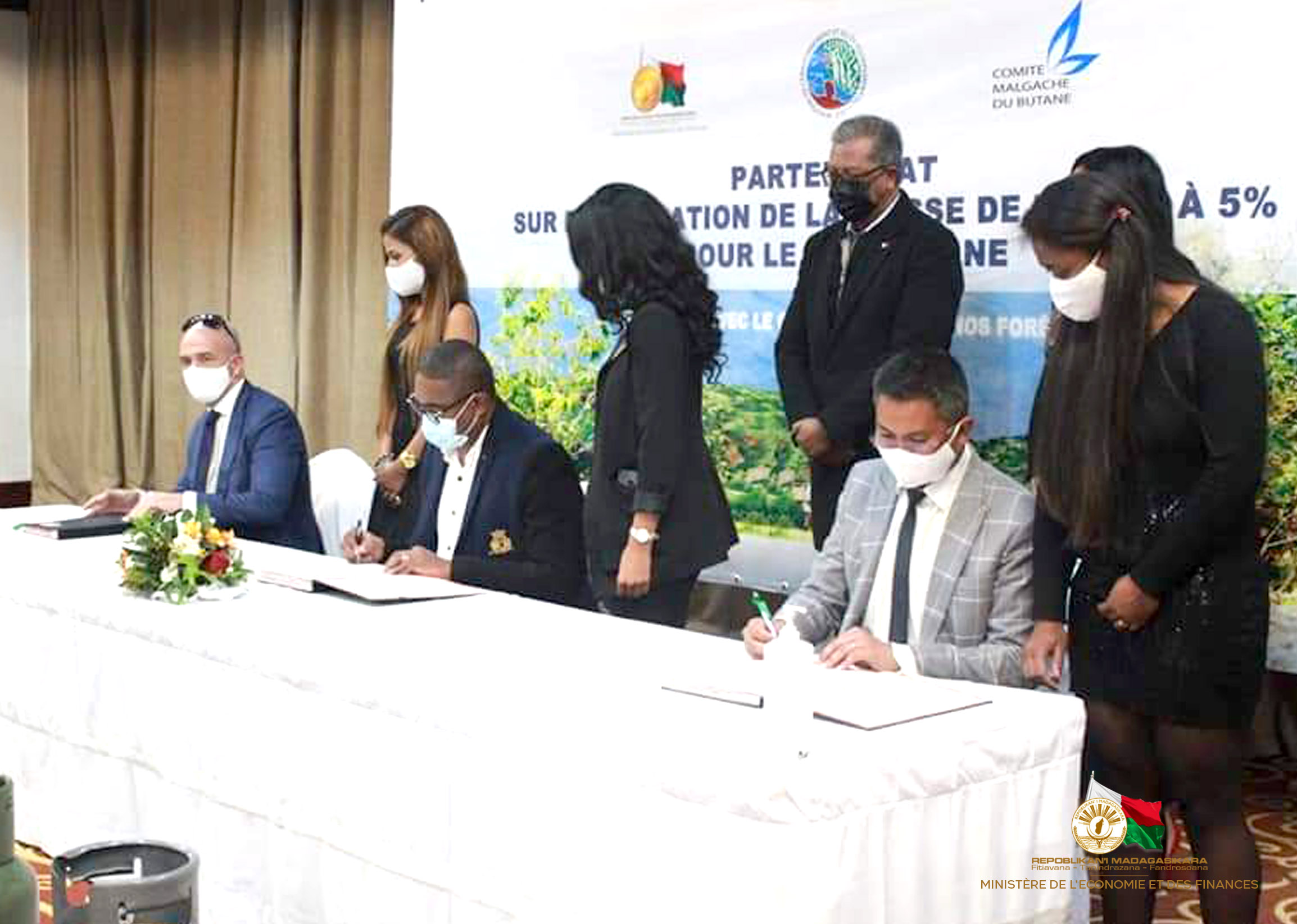 Convention de collaboration entre le Ministère de l’Environnement et du Développement Durable (MEDD), le Ministère de l’Economie et de Finance (MEF) et le Comité Malgache Du Butane (CMDB) Conscient des problèmes de dégradation accrue de l’environnement et la perte de biodiversité liés à la situation économique et la pauvreté, le gouvernement malagasy fait de la protection de l’environnement un élément indissociable du développement durable. A cet effet, Madagascar entend mettre en œuvre toutes les dispositions permettant de faire face aux impacts sur le changement climatique. Ainsi, la promotion des énergies de substitution au charbon de bois et bois de chauffe figure parmi les priorités du gouvernement en ce que celle-ci contribue de manière significative à la réalisation de l’ODD 7, misant sur l’accès de tous aux services énergétiques fiables, durable et moderne à un coût abordable. Pour rappel, le gaz butane a été proposé pour être exonéré de TVA par le Ministère de l’Economie et des Finances courant novembre 2019, cependant le projet n'a pas été adopté par le Parlement. En 2020, le Ministère de l’Economie et des Finances, revient sur la proposition de modification des dispositions relatives à la fiscalité du gaz butane, avec une collaboration active du Ministère de l’Environnement et du Développement Durable, notamment suite à une sollicitation du Comité Malgache Du Butane (CMDB) de diminuer le taux de TVA sur le gaz butane de 20% à 5%. Approuvée par les autorités malagasy, une convention de collaboration entre le Ministère de l’Environnement et du Développement Durable (MEDD), le Ministère de l’Economie et de Finance (MEF) et le Comité Malgache Du Butane (CMDB) a été établie en vue de démocratiser l’utilisation du gaz butane à Madagascar. Comme stipulée dans la convention de collaboration, cette réduction de taxe va induire, pour cette première année « 2021 » :