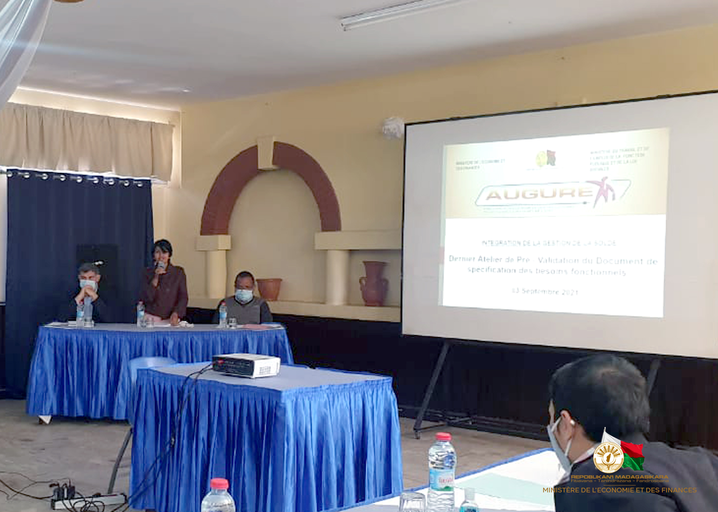 AUGURE 2 : Atelier de pré-validation des activités liées à la solde Dans le cadre de l’intégration des modules de gestion de carrière dans AUGURE 2, une séance de pré-validation des activités liées à la Solde a eu lieu le 03 septembre 2021 au Motel Anosy. Cet atelier a été honoré par la présence du Directeur des Etudes et des Affaires Juridiques et du Directeur du Système Informatique du MTEFPLS (Ministère du Travail, de l’Emploi, de la Fonction Publique et des Lois Sociales) ainsi que de l’expert en SIRH (Système Informatique des Ressources Humaines) du NFD/UE. Une cinquantaine de participants issus du Ministère de l’Economie et des Finances et du Ministère en charge de la Fonction Publique se sont réunis lors de cette journée. Concrètement, cet atelier a eu pour objet la pré-validation du document de spécification des besoins fonctionnels des modules « Recrutement-Mobilité-Cessation définitive de fonction/Traitement des Hauts Emplois de l’Etat/Validation et secours au décès/Avancement-Récompense-Discipline ». L’objectif fixé pour cette séance a été de recueillir des observations et des améliorations émanant des spécialistes métiers. A l’issue de quoi, le document devrait être facile à utiliser et être validé par les équipes métiers. Faisant suite à cette journée de concertation, un autre atelier devrait se tenir pour la pré-validation de ces activités sur le plan informatique.
